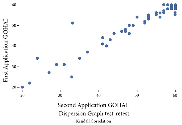 The results as displayed by the GOHAI Colombian version validation, show the correlation measurement to be quite good by yielding a 0.85 Kendall’s coefficient, with a perfect relationship being 1.0, indicating that the Colombian GOHAI has equal or higher test-retest reliability in comparison with the validation of GOHAI versions in other countries; only the Greek, French, Tamil and Dutch versions 26,30,31,35 showed slightly higher correlations.