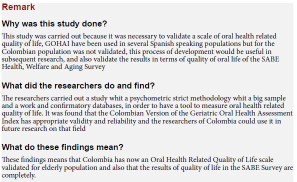 As a first result, to the experts’ judgement, the GOHAI scale shows adequate content and appearance validity.