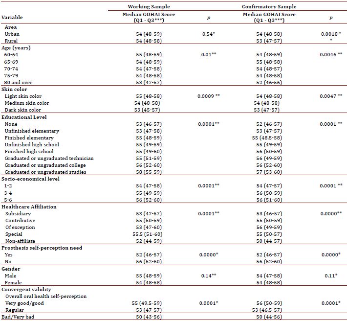 Upon being a self-reported scale on a personal construct, which has no gold standard, the GOHAI scale assesses its criteria validity through discriminant and convergence analysis. The discriminant aspect sheds lights on the scale’s ability to differentiate between groups where it must do so, and its inability to differentiate the groups where it must not; this was analyzed though the relationship between the GOHAI total score and socio-demographic variables such as area, age, skin color, educational level, socioeconomic level, healthcare affiliation, self-perception of oral prostheses need and gender. The relationship with the oral health self-perception assessment was used for convergent validity, which inquires how the target construct measured by the studied scale converges to or relates with other scales assessing similar constructs. Kruskal-Wallis’ or Mann-Whitney’s tests were utilized to stablish differences between medium-sized groups depending on the dichotomy or categorical nature of the variables; these tests have been widely used throughout GOHAI validation literature 2,23.