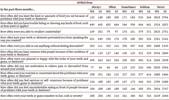 Cronbach’s Alpha was 0.80 for both WS and CS, thus demonstrating high correlation and homogeneity among the GOHAI items. The item-scale correlations ranked between 0.49-0.70 for WS and 0.46-0.72 for CS, with an exception for questions 3 and 4 where both samples correlation ranked between 0.35 and 0.4.