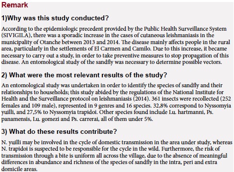 Conclusión: Se estableció, que por sus altas abundancias y por sus antecedentes vectoriales para el país y para la zona de estudio, Nyssomyia yuilli y Nyssomyia trapidoi, constituyen las especies de flebótomos que pueden estar implicadas en la transmisión de leishmaniasis cutánea en la zona de estudio