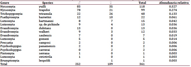 Were recollected 361 sandflies (252 females and 109 males), belonging to 9 genres and 16 species. 32,8% and 27,5% correspond to Nyssomyia yuilli and Nyssomyia trapidoi respectively; followed, with a wide difference, by Trichopygomyia triramula, Psathyromyia barrettoi majuscula, Lutzomyia hartmanni, Lutzomyia sp. of pichinde, Evandromyia dubitans, Evandromyia walkeri, Evandromyia saulensis and Lutzomyia gomezi. The other 6 species were scarce, representing less than 1% of the total (Table 1).