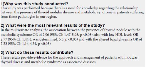 The associations shown in this study allow us to increase awareness about the risk of developing thyroid nodular disease in patients with metabolic syndrome and promote greater emphasis on controlling and managing components that have been proven greater association to prevent from the appearance of said nodules. There are also studies where it has been shown that the use of metformin in patients with small thyroid nodules and insulin resistance, significantly reduce the size thereof 33.