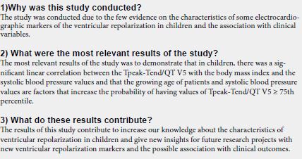 Despite these limitations, this research is the first to perform a characterization of ventricular repolarization through Tp-e in children and its relationship with clinical variables. This will allow a better understanding of the variations observed in these parameters in medical practice and will help to carry out further studies that evaluate the true role that may or may not have in the risk stratification of patients with increased risk of ventricular arrhythmias.
