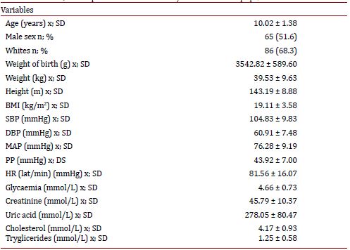 Each child received three blood pressure measurements at different times. Qualified personnel took the blood pressure measurements, with digital blood pressure equipment correctly calibrated and with the appropriate bracelets to the circumference of the arm. The recommendations for taking blood pressure for patients of these ages were respected, with adequate lighting, ventilation and the previous rest of at least 10 minutes. All children included in the study had blood pressure values <95 percentile for their age, sex and height. An average of the three measurements was obtained to define the values of systolic and diastolic blood pressure. The mean arterial pressure was calculated by the formula: PAS-2(PAD)/3 and pulse pressure: PAS-PAD. The blood pressure variables are expressed in millimeters of mercury (mmHg).