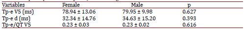 Table 2 shows that there are not significant differences after comparing the electrocardiographic parameters in males and females, Tp-e V5 (79.95 ± 9.98 ms vs. 78.94 ± 13.06 ms; p= 0.627), Tp-e d (34.63 ± 15.20 ms vs. 32.34 ± 14.76 ms; p= 0.393) and Tp-e/QT V5 (0.23 ± 0.02 vs. 0.23 ± 0.03; p= 0.616) respectively.