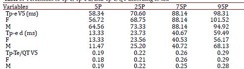 A study published by Braschi et al. in 606 patients demonstrate that the mean for the Tp-e in V5, Tp-e d and Tp-e/QT V5 in female and male patients between the ages of 9 and 11 are (83.6 ± 7.3 ms vs. 84.1 ± 9.1 ms), (22.3 ms ± 10.2 ms vs. 27.7 ± 8.1 ms) and (0.22 ± 0.02 vs. 0.22 ± 0.02) respectively. In this study, the values of the 25 and 75 percentiles for the Tp-e in V5, Tp-e d, and Tp-e/QT V5 are (80 ms, 90 ms); (20 ms, 30 ms); (0.21, 0.23) respectively (9. In our investigation, the mean, the 25 and 75 percentiles of the Tp-e in V5 are lower than those observed in the previous study, while for the rest of the parameters the values are higher. The differences observed in these studies may be related to differences in patient age, sex, sociodemographic characteristics and even hereditary factors that have been demonstrated to be associated with Tp-e values (10. The variety of factors or circumstances that can modify the values for these parameters generates difficulties in determining reference values that can be used universally. Moreover, the sample size of the studies published on this subject is insufficient to reach definitive conclusions.