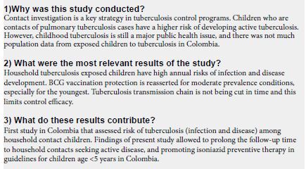 Our findings allowed to modify some policies in Colombia, including a prolongation of follow-up time to household contacts seeking active disease, and promoting isoniazid preventive therapy in guidelines for children age <5 years.