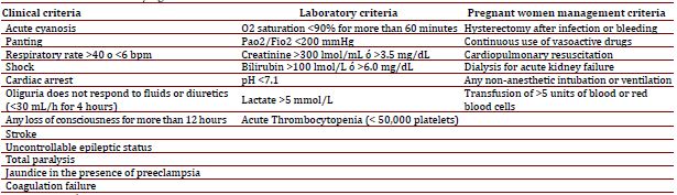 In the framework of this recommendation, Okong et al in 2006 proposed a set of criteria to identify extreme maternal morbidity in Africa, which are not supported by criteria related to laboratory tests, due to the inability to access some technologies 16. This proposal was considered very consistent, since it was mainly based on clinical criteria of organ dysfunction or systems for the identification of pregnant women who could present with extreme maternal morbidity, as proposed in the original publication by Say 13,16. It also took into account some situations that have to do with the management provided to pregnant woman, such as an emergency hysterectomy, anesthetic accidents, and patient's admission to an Intensive Care Unit (ICU).