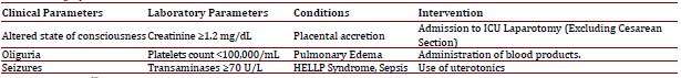 In the absence of consensus, the Pan American Health Organization (PAHO) led in 2016 a collaborative investigation in Latin America to assess the predictive value of the criteria used to classify a case as maternal near miss (18. The results of this study made it possible to establish that from the clinical parameters that were considered, the alteration of the state of consciousness, be it coma or mental confusion, and criteria such as oliguria and seizures were associated with a greater occurrence of maternal near miss. Table 2 lists the parameters with the highest predictive value from the clinical/laboratory tests point of view, clinical conditions, and the interventions required for the management of pregnant women 18.