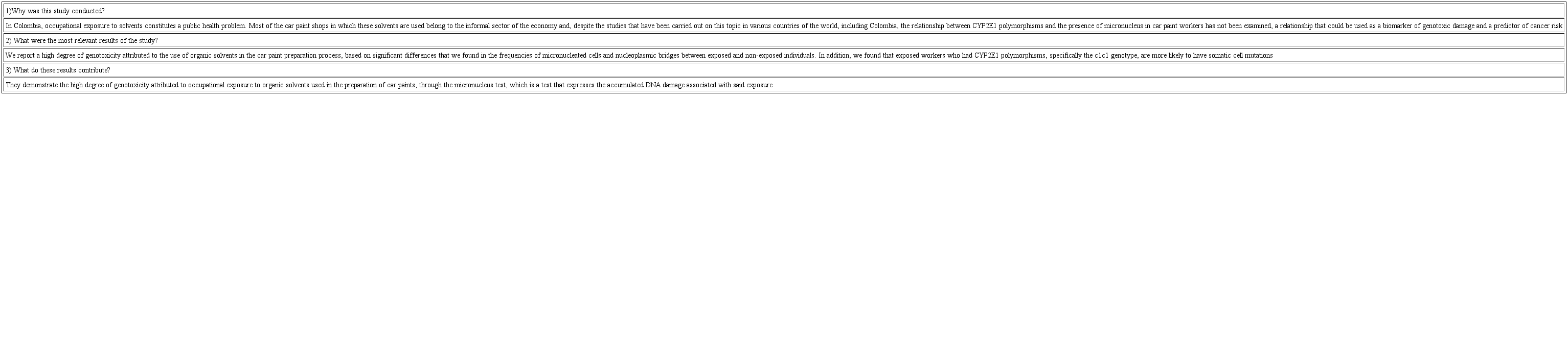 In Colombia, occupational exposure to solvents constitutes a public health problem. Most car paint shops belong to the informal sector of the economy, which explains why their workers do not observe biosecurity measures or have medical services focused on the prevention of health risks. In addition, the low level of schooling is reflected in their lack of knowledge about the potential protection measures and the consequences that exposure to organic solvents have on health. It is usual for these informal workers to make the paint on their own, ignoring national or international quality standards. Furthermore, their workday may extend beyond the eight hours a day established by Colombian law, conditions that also increase the risks of genotoxic exposure. Although some studies have been conducted worldwide on this topic, including Colombia 20,23, the relationship between the CYP2E1 polymorphisms and the presence of micronuclei in car paint shop workers have not been examined, which could be used as biomarkers of genotoxic damage and predictors of cancer risk. Consequently, it is necessary to characterize the health and work conditions of individuals occupationally exposed to organic solvents used in car paint workshops in Bogota, Colombia, to alert to the possible onset and extent of early genetic damage, as well as to identify the risk of long-term health problems and to take preventive actions aimed at promoting health. To this end, the behavior of genotoxicity and genetic susceptibility biomarkers was evaluated to suggest preventive measures to minimize exposure and thus the likelihood of presenting genotoxic damage.