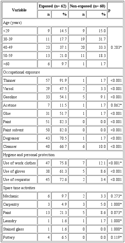 One hundred twenty-two male workers participated in the study; 62 worked in painting workshops exposed to solvents and 60 were not exposed. Exposed workers had an average age of 43.9 ±12.4 years and an average exposure time of 21 ±11 years; meanwhile, the average age for unexposed workers was 40.1 ±10.6 years. There were no statistically significant differences (p= 0.067) for age in the two groups of workers. In addition, 39% (n= 24) of them were working as painters, 19% (n= 12) as mechanics, 16% (n= 10) as auto body repairers, 8% (n=5) as colorists, and the rest worked in administrative areas (Table 1). Significant differences were found for occupational exposure, hygiene and protection elements variables being higher for the exposed group.