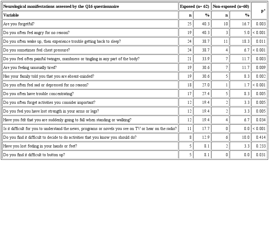Manifestations such as emotional and mood disorders, as well as working and short-term memory disorders, have been associated with chronic exposure to solvents 29. Statistically significant differences between the exposed and non-exposed groups were found related to some symptoms included in the Q16 questionnaire such as being forgetful, feeling angry for no reason, feeling pressure in the chest, having trouble concentrating, feeling sad or depressed without reason, among others 30. In addition, a third of those exposed (32%) reported more than six of the symptoms included in that questionnaire, which would suggest a risk of neurotoxicity.