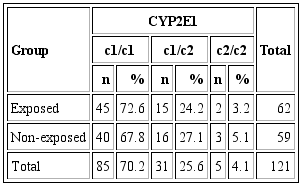 The CYP2E1 allele frequencies were in Hardy-Weinberg equilibrium (p=0.331). There were no statistically significant differences in the CYP2E1 polymorphism genotype characterization of the two groups (p=0.749, exact likelihood ratio test). Only one blood sample from the non-exposed group could not be processed (Table 3).