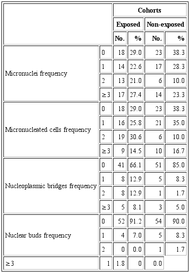 When compared the characteristics evaluated in the CBMN, there were statistically significant differences between the two groups regarding micronucleated cells and nucleoplasmic bridges frequencies (exact likelihood ratio p-values were 0.042 and 0.046, respectively) being higher for the exposed group. For the micronuclei and nuclear buds frequencies, there were no significant differences (exact likelihood ratio p-values were 0.296 and 0.933, respectively) (Table 4).