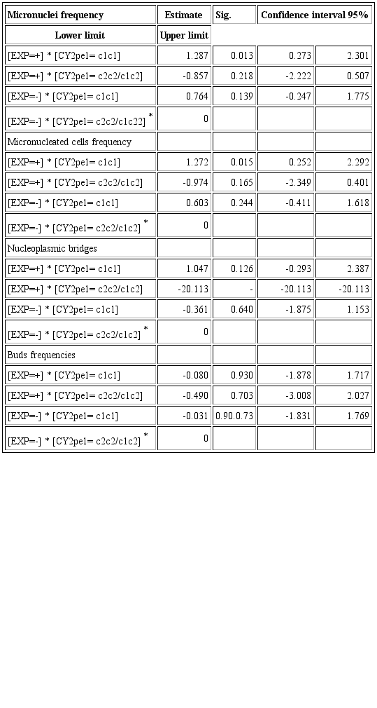 Heterozygous individuals (c1c2) were grouped with homozygotes (c2c2) in the determination of the effect of each CYP2E1 genotype on chromosome damage, due to the low number of individuals with a homozygous genotype. Statistically significant differences were found for the interaction of c1c1 genotype and the occupational exposure to organic solvents, with higher frequencies of micronuclei and micronucleated cells (Table 5). No significant association was found for nucleoplasmic bridges and nuclear buds frequencies.