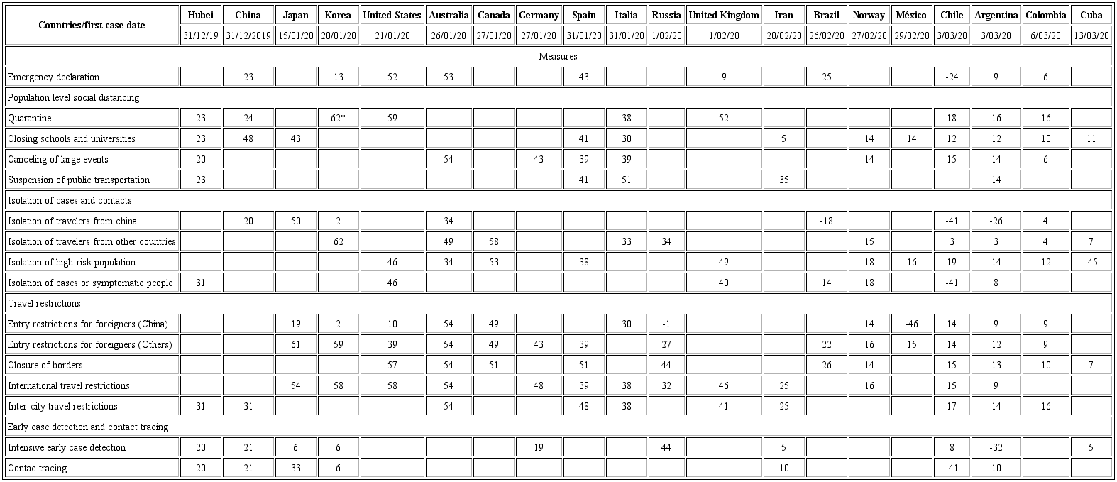 Result: Some countries are focused on establishing travel restrictions, isolation of identified cases, and high-risk people. Others have a combination of mandatory quarantine and other drastic social distancing measures. The timing to implement the interventions varied from the first fifteen days after detecting the first case to more than 30 days. The effectiveness of isolated non-pharmaceutical interventions may be limited, but combined interventions have shown to be effective in reducing the transmissibility of the disease, the collapse of health care services, and mortality. When the number of new cases has been controlled, it is necessary to maintain social distancing measures, self-isolation, and contact tracing for several months. The policy decision-making in this time should be aimed to optimize the opportunities of saving lives, reducing the collapse of health services, and minimizing the economic and social impact over the general population, but principally over the most vulnerable. The timing of implementing and lifting interventions could have a substantial effect on those objectives.