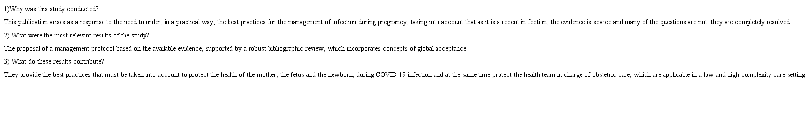 It is important to bear in mind that this is a changing situation and the concepts that are delivered here can be updated as long as new information is generated, and its application will depend on the pandemic epidemiologic moment. However, it is clear that the provided evidence up to now gives us enough information to protect the expectant mother as well as to protect the health-care personnel, avoiding panic situations and assuming a good sense attitude that will be undoubtedly beneficial for all the society.