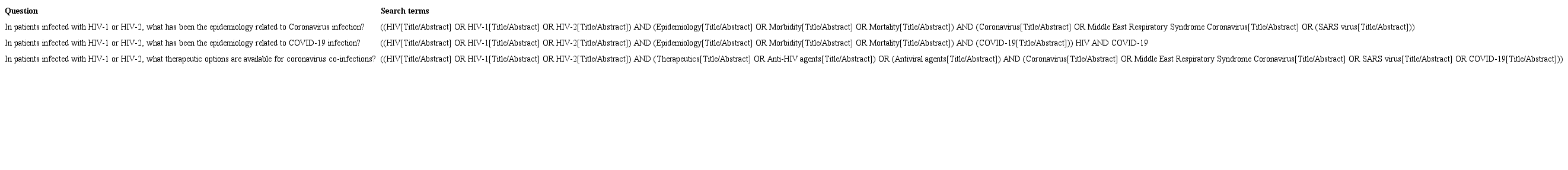 SARS-CoV-2 infection, the name given to the new coronavirus, and the disease resultant from this virus, coronavirus disease 2019 (COVID-19), has been declared a global health emergency categorized as a pandemic by the World Health Organization (WHO) 1. Like other coronaviruses, SARS-CoV-2 infects the epithelial cells of the pulmonary alveoli, producing pneumonia, although some reports have described infection in different organs and systems, including gastrointestinal symptoms, especially in children 2. Although the mortality of the infection is around 5.6% currently 3, the actual burden of the disease is not yet known, and recent reports have estimated that 81% of those infected develop mild symptoms, while 14% have severe symptoms, and 5% become critically ill 4. As we learn more about the epidemic and infection, we have been able to establish that the most severe cases and mortality are associated with underlying health conditions, the most common being hypertension, diabetes, and cardiovascular disease 5. Under these circumstances, centers and clinicians around the world have wondered if there is an increased risk of morbidity and complications in immunocompromised patients 6. Based on the above, we consider the following review to assess current evidence regarding the impact and possible recommendations of care in an immunosuppressed population, such as that of persons with HIV. To develop the review, we relied on a series of clinical questions that allowed us, as of April 6, 2020, to develop a search for scientific literature that would help us answer them. The search was carried out on PubMed and a review of conferences, expert commentary, and recommendations in international scientific societies. Table 1 shows the search equation used in PubMed for answering the revision questions.