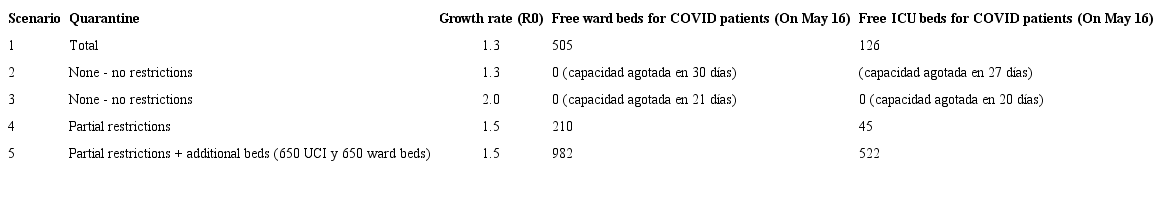 Conclusiones: No se espera que el levantamiento lento de las restricciones de distanciamiento social y la reapertura de la economía provoquen un agotamiento total de los recursos en octubre si la tasa de crecimiento diario se mantiene por debajo del 8%. Aumentar el número de camas disponibles proporciona una protección contra tasas de infección ligeramente más altas. Los modelos predictivos se pueden utilizar de forma iterativa para obtener predicciones matizadas que ayuden a la toma de decisiones.