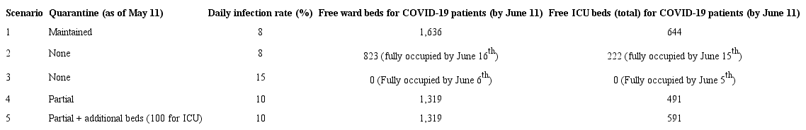 Results: We estimated 67,700 cases by October 15th when assuming the implementation of a quarantine, 80,400 and 101,500 cases when assuming partial restrictions at 4% and 8% infection rates, respectively, and 208,500 with no restrictions. According to different scenarios, the estimated demand for reverse transcription-polymerase chain reaction tests ranged from 202,000 to 1,610,600 between September 1st and October 15th. The model predicted depletion of hospital and ICU beds by September 20th if all restrictions were to be lifted and the infection growth rate increased to 10%.