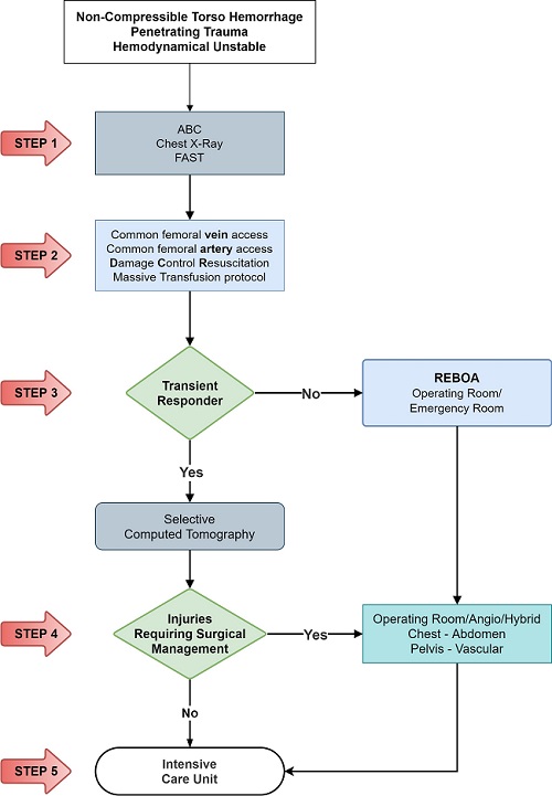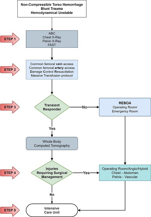 We have devised new algorithms that address in 5 easy to understand steps on how to manage a hemodynamically unstable patient suffering from Noncompressible torso hemorrhage from both blunt (Figure 1) and penetrating trauma (Figure 2):