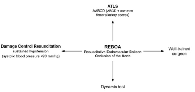 Palabras clave: Balón de resucitación endovascular de oclusión aórtica, control de daños, hemorragia no compresible del torso, hemodinámicamente inestable, heridas penetrantes, puntuación de gravedad de la lesión, centros de trauma, atención de soporte vital avanzado para traumatismos, heridas no penetrantes, procedimientos endovasculares, REBOA.