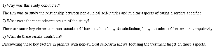 Therefore, the aim of this research was to verify the influence of non-suicidal self-harm in patients with eating disorders, specifically in women who have already developed anorexia nervosa and bulimia nervosa, and the relationship with certain characteristics of eating disorders such as body dissatisfaction, impulsivity, alexithymia and self-esteem. Through this study we will be able to improve and develop effective treatments for these disorders.