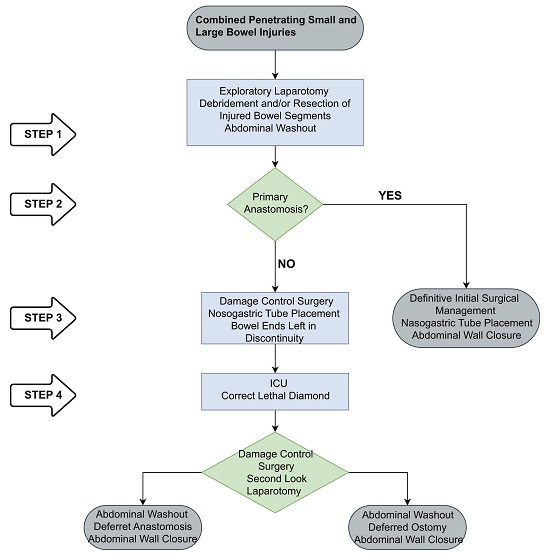 Key words: Penetrating Combined Small and Large Bowel Injuries, Damage Control Surgery, Definitive Laparotomy, Primary Anastomosis, Deferred Anastomosis, Ostomy, Injury Severity Score, Laparotomy, Anastomotic Leak, Surgical Anastomosis, Fistula.