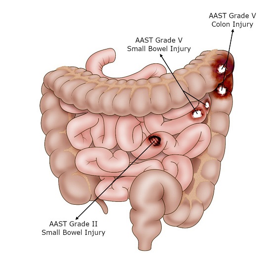 Taken together, the small and large bowel represents the most common organs injured in penetrating thoraco-abdominal trauma 2. This anatomical area extends from the level of the nipples to the inguinal ligament anteriorly, and from the tip of the scapula to the buttock crease posteriorly. The nature and severity of bowel injury associated with penetrating trauma range from minor bruising to complete devascularization of the compromised segment 12. According to the mechanism of injury, gunshot or shotgun wounds are more likely to result in multiple injuries to the hollow viscera (>80%) compared to stab wounds (30%) 13. Bullets usually cause pared perforations and are associated with areas of tissue damage and frank necrosis by direct contact and the dissipation of energy lateral to the path of the missile (blast effect). Because the small bowel occupies most of the true abdominal cavity, it is predisposed to greater injury when compared to the colon 14. In general, bowel injuries are classified in non-destructive and destructive lesions. Nondestructive injuries are wounds that involve less than 50% of the bowel wall (AAST Grade I-II) or greater than 50% without transection (AAST Grade III). Destructive injuries are completely transected bowel (AAST Grade IV) with segmental tissue loss or devascularization (AAST Grade V) 12,15 (Table 1).
