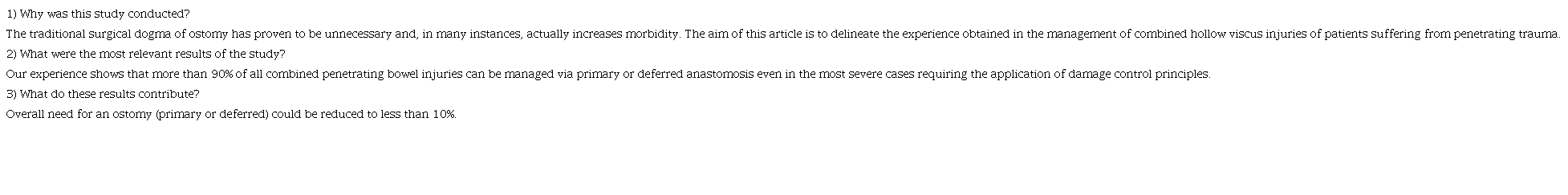 Abstract: Hollow viscus injuries represent a significant portion of overall lesions sustained during penetrating trauma. Currently, isolated small or large bowel injuries are commonly managed via primary anastomosis in patients undergoing definitive laparotomy or deferred anastomosis in patients requiring damage control surgery. The traditional surgical dogma of ostomy has proven to be unnecessary and, in many instances, actually increases morbidity. The aim of this article is to delineate the experience obtained in the management of combined hollow viscus injuries of patients suffering from penetrating trauma. We sought out to determine if primary and/or deferred bowel injury repair via anastomosis is the preferred surgical course in patients suffering from combined small and large bowel penetrating injuries. Our experience shows that more than 90% of all combined penetrating bowel injuries can be managed via primary or deferred anastomosis, even in the most severe cases requiring the application of damage control principles. Applying this strategy, the overall need for an ostomy (primary or deferred) could be reduced to less than 10%.
