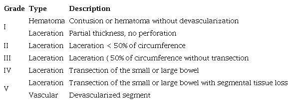 Moore E, Cogbill T, Malangoni M, Jurkovich G, Champion H, Gennarelli T, et al. Organ injury scaling, II: pancreas, duodenum, small bowel, colon and rectum. J Trauma. 1990;30:1427-9.
