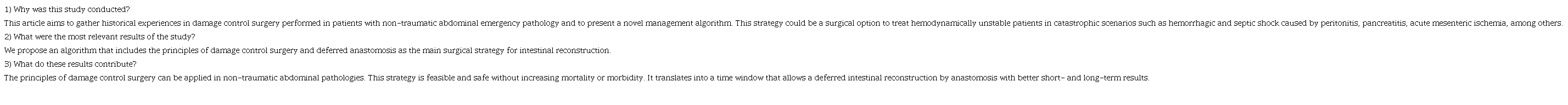 Damage control surgery is based on temporal control of the injury, physiologic recovery and posterior deferred definitive management 1. This strategy has been traditionally performed in patients with severe abdominal and/or thoracic trauma 2,3. However, scenarios of hemodynamically unstable non-trauma patients with emergency pathologies treated with damage control surgery have been described but remain controversial in feasibility and safety 4-6. Therefore, this article aims to gather historical experiences in damage control surgery performed in non-traumatic abdominal emergency pathology patients with the presentation of a novel management algorithm.
