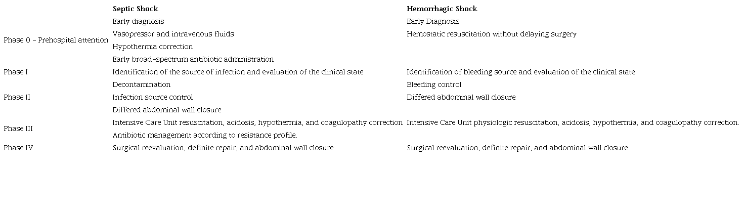 Two main pathophysiologic events that compromise the patient's life are a hemorrhagic and septic shock. Sepsis is an imbalance between anti-inflammatory and pro-inflammatory factors associated with an infectious process 23. Damage control surgery allows rapid control of abdominal contamination, avoiding major tissue injury and/or late interventions, which translates into an early resuscitation and physiological recovery 22.