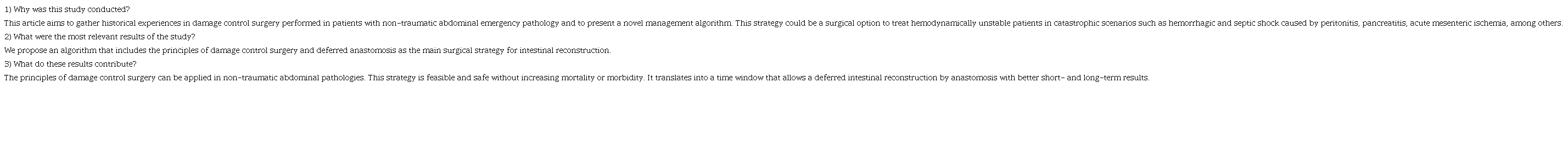 The indications for damage control surgery in non-traumatized patients are a matter of debate. Evidence indicates that the application of damage control surgery in patients with no severe physiological compromise could be non-beneficial 22. Nevertheless, the impact of differed abdominal closure, surgical technique, intestinal repair type, and the comparison with conventional management is not defined. Our Trauma and Emergency Surgery group have studied these issues for the past 30 years in non-traumatic critically ill patients.
