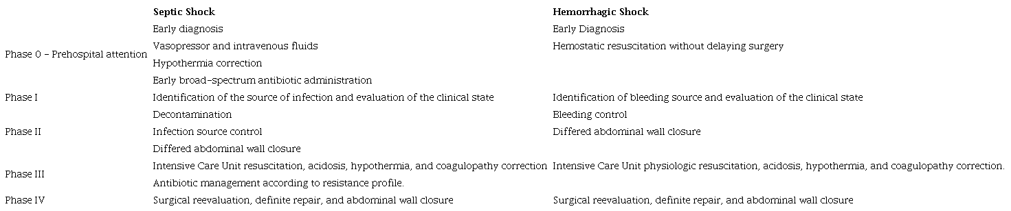 Two main pathophysiologic events that compromise the patient's life are a hemorrhagic and septic shock. Sepsis is an imbalance between anti-inflammatory and pro-inflammatory factors associated with an infectious process 23. Damage control surgery allows rapid control of abdominal contamination, avoiding major tissue injury and/or late interventions, which translates into an early resuscitation and physiological recovery 22.