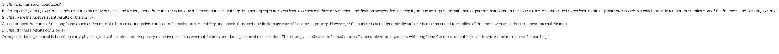 Abstract: In Orthopedics, damage control is indicated in patients with pelvic and/or long bone fractures associated with hemodynamic instability. It is inappropriate to perform a complex definitive reduction and fixation surgery for severely injured trauma patients with hemodynamic instability. In these cases, it is recommended to perform minimally invasive procedures that temporarily stabilize the fractures and bleeding control. Closed or open fractures of the long bones such as femur, tibia, humerus, and pelvis can lead to hemodynamic instability and shock. Thus, orthopedic damage control becomes a priority. However, if the patient is hemodynamically stable, it is recommended to stabilize all fractures with an early permanent internal fixation. These patients will have a shorter hospital length of stay and a reduction in mechanical ventilation, blood components transfusions and complications. Therefore, the concept of orthopedic damage control should be individualized according to the hemodynamic status and the severity of the injuries. Open fractures, dislocations, and vascular injuries could lead to permanent sequelae and complications if a correct management and approach are not performed.