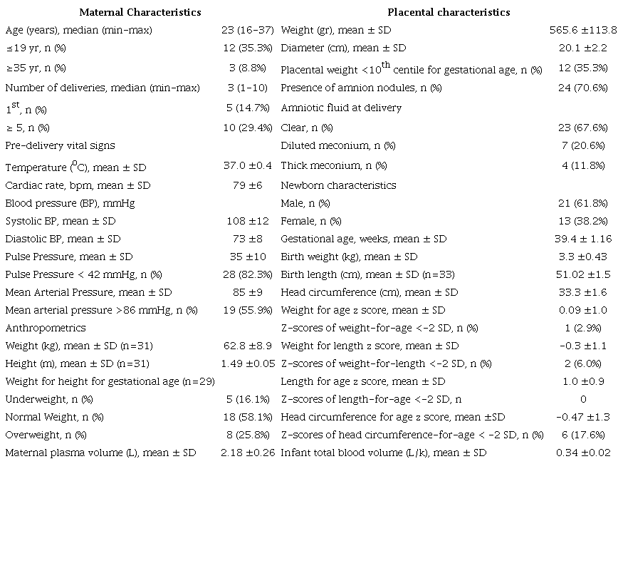 Métodos: En 34 pares madre-recién nacido, se midieron peso y diámetro placentario, y se analizaron muestras de sangre materna y de cordón umbilical para hemograma completo, proteína-C reactiva (PCR), ferritina, receptor sérico de transferrina (RsTf), vitaminas A y D. Se usó la fórmula de Nadler para calcular volúmenes sanguíneos.
