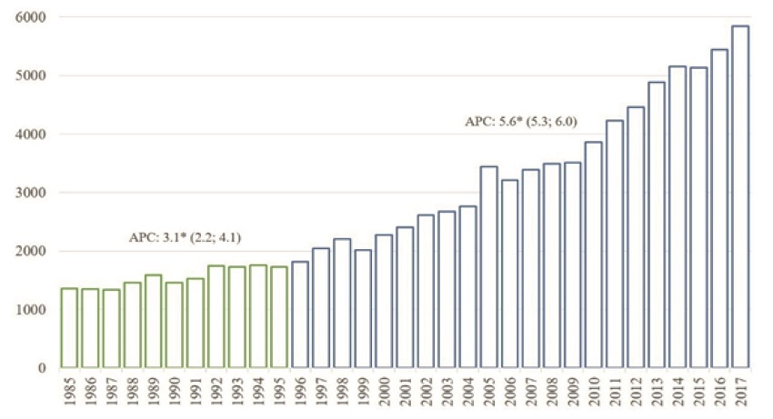 From 1985 to 2017, 93,821 new cases of cancer were diagnosed among residents of Quito (Figure 2). The number of cases went from 1,355 in 1985 to 5,846 in 2017. The trend throughout the entire period was towards an increase, with different patterns in two periods, changing from an APC of 3.1 (Confidence Intervals at 95% (CI 95%): 2.2-4.1) in the period 1985-1995, to an APC of 5.6 (CI 95%: 5.3-6.0) from 1996 (Figure 2).