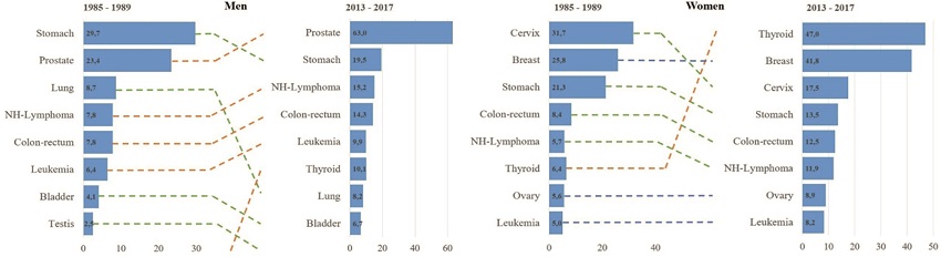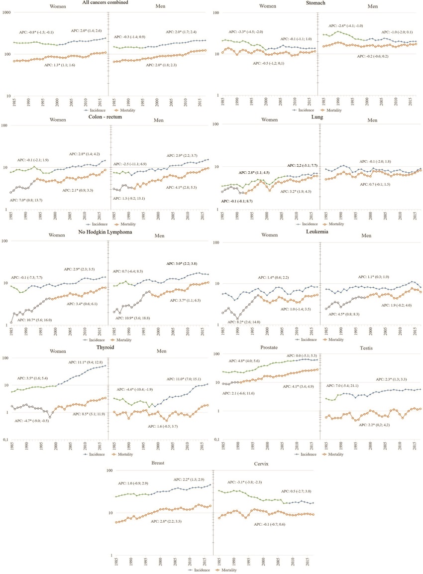 Results: Throughout the study period, there was a sustained increase in both incidence rates (APC male= 2.0, 95% CI: 1.7-2.4; APC female= 2.0%, 95% CI: 1.4-2.6), as in mortality rates (APC male= 2.0%, 95% CI: 1.8-2.3; APC female= 1.3%, 95% CI: 1.1-1.6). Cancer incidence and mortality rates of the breast, prostate, colon-rectum, thyroid, and lymphoma increased, while the incidence rates of cervical and stomach cancer initially decreased, then stagnation was observed.