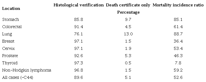 The Quito Registry is one of the 5 PBCRs in the country considered to be of high quality by the International Association of Cancer Registries (IACR), together they cover 41.4% of the population of Ecuador 10. Information about its history, objectives and methodology has been widely described in previous publications 7,11. Regarding quality indicators, for the period 2013-2017 these reach adequate values: 89.6% of histological verification (HV), 5.1% of cases that were admitted only by death certificates (ODC) and a Mortality/Incidence ratio (M/I) of 52.6% for both sexes (Table 1).