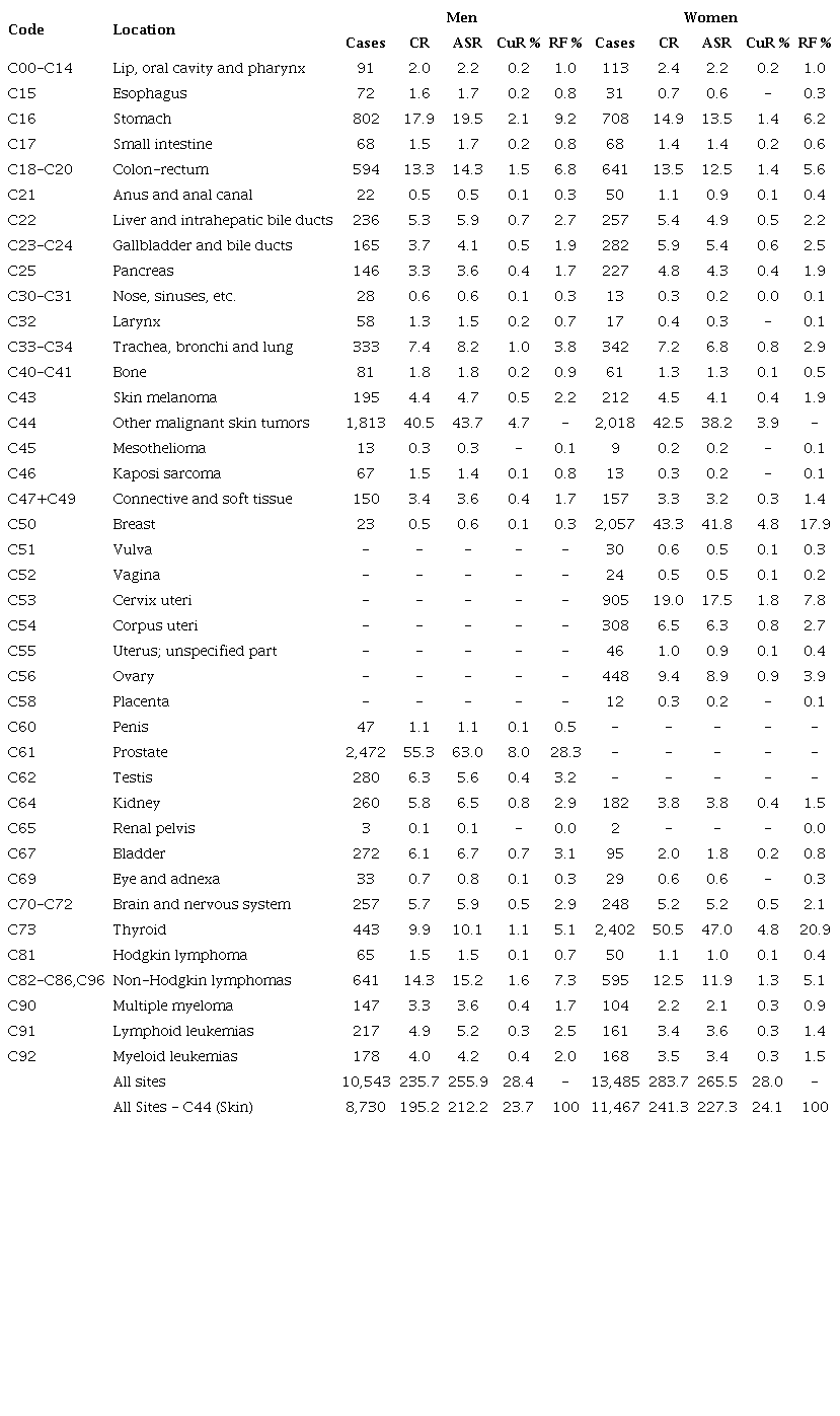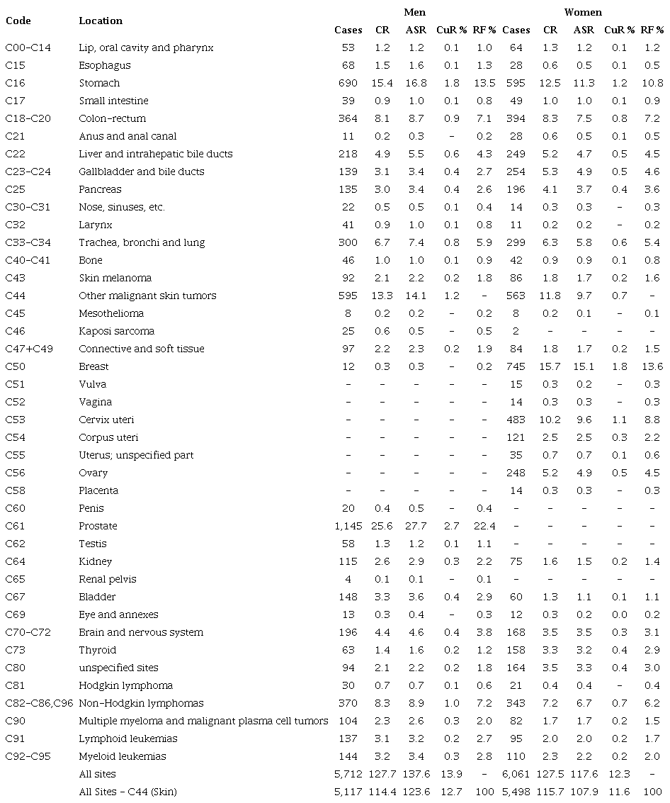 Cancer data are presented according to the International Classification of Diseases ICD 10. The standardized rates by age (ASR) and sex, of incidence and mortality for the period 2013-2017, were calculated by the direct method using the world standard population of Segi 12. Crude rates (CR), cumulative rates (CuR) and the relative frequency (RF) of the most frequent locations are also presented. Non-melanoma skin cancer (C44) data are shown but excluded in the overall rate results.