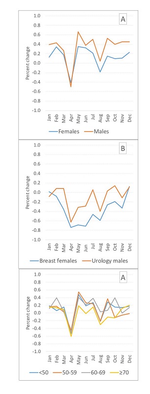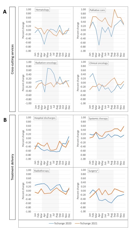 To identify seasonal variations for cross-cutting services, multidisciplinary units, and treatment delivery, we report monthly trends in total numbers for the average between 2017-2019 and for the years 2020 and 2021. Additionally, for every service, we estimated percent change month-by-month during 2020 and 2021 compared to the annual average for the corresponding service during 2017-2019, exception made for oncology surgery, for which information was only available since 2019. In doing so, we can compare the magnitude of the impact for different service categories, regardless of the total number of observations in every service analyzed. The percent change was also estimated globally by sex and age groups for cross-cutting services.