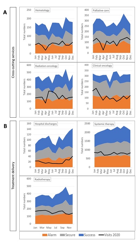 We collected data from January 1st-2017, to December 31th-2021 Aggregated monthly data asthe number of visits/procedures were retrieved from institutional databases, including the inpatient HUSI system (SAHI), outpatient HUSI system (Capacidades), and outpatient CJO system (SAHICO). Additionally, the clinical stage at diagnosis was obtained from databases of specialized multidisciplinary clinics. Only data linked to new cases in each time series were considered (2017, 2018, 2019, 2020, 2021). They were filtered by first-consultation date (cross-cutting services and multidisciplinary cancer units), histopathological diagnosis date (cancer staging), and treatment delivery date (systemic therapy, radiotherapy, surgery).