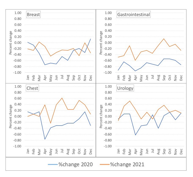 Despite not having a screening program, the early-stage stomach cancer decrease could be related to reduced endoscopic examinations, particularly considering the high risk due to potential aerosolization and transmission of SARS-Cov-2 28. A reduction in endoscopic procedures was reported in the USA, where 98.6% of centers delayed elective endoscopies for a mean of 5.8 weeks 29, and in Northern Ireland, where diagnoses of gastroesophageal cancer declined by 26.6% 29. Interestingly, instead of a decrease, early-stage lung cancer showed a slight (not significant) increase throughout the year (Figure 5). This might be related to the increased imaging examinations as part of the COVID-19 diagnostic workup, even in mildly symptomatic patients, accidentally revealing early-stage disease that would otherwise not have been diagnosed. However, further research is anticipated.