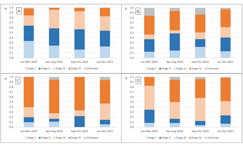 The clinical stage at diagnosis, defined per the AJCC-UICC 8th edition 16, was grouped for pre-confinement (January-March), confinement (April-August), and post-confinement (September-December) periods during 2020 and for the year 2021. Percentages of stages I through IV for breast, stomach, prostate, and lung cancer are reported, assuming, for comparative purposes, stages I-II as early disease and III-IV as advanced disease. Similarly, we retrieved data for multiple myeloma.