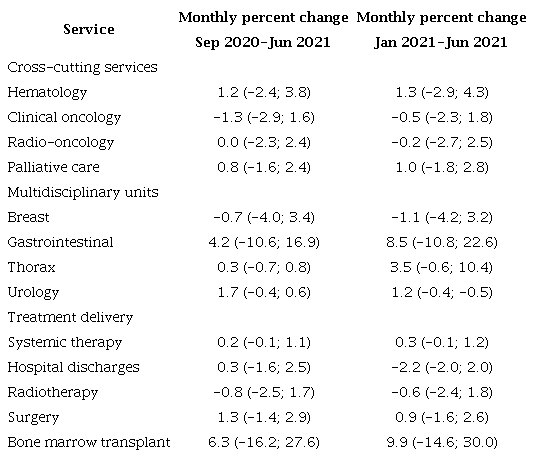Except for radiotherapy, the data for 2021 showed a general increase of demand with different monthly patterns for palliative care and clinical oncology consultations. No statistically significant MPC was observed; however, we observed a reduced MPC for the first semester of 2021 compared with the estimated MPC for all ten months post-confinement in new patients’ consultations for the urology multidisciplinary unit and in-hospital systemic therapy (hospital discharges), with a change from a positive to a negative trend in the latter. The remaining services showed either variations below 0.5% between the two periods or a positive trend (Table 1).