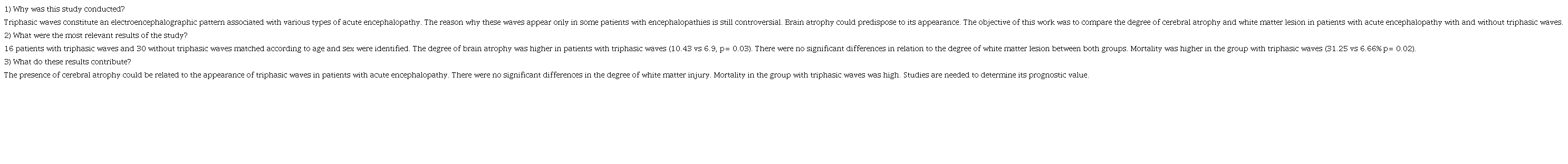 Since its initial description in patients with hepatic encephalopathy, by Foley et al in 1950 and Bickford & Butt in 1955, Triphasic waves have been associated with various types of acute encephalopathy, including those of toxic, metabolic origin, secondary to sepsis, anoxia, among others 2,3. However, the reason why these waves appear only in some patients with acute encephalopathy is still controversial.