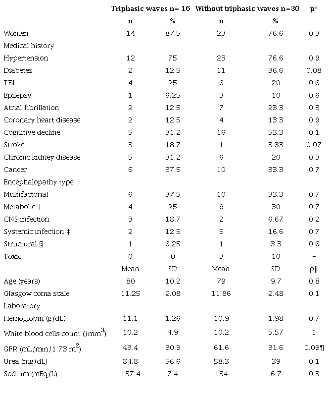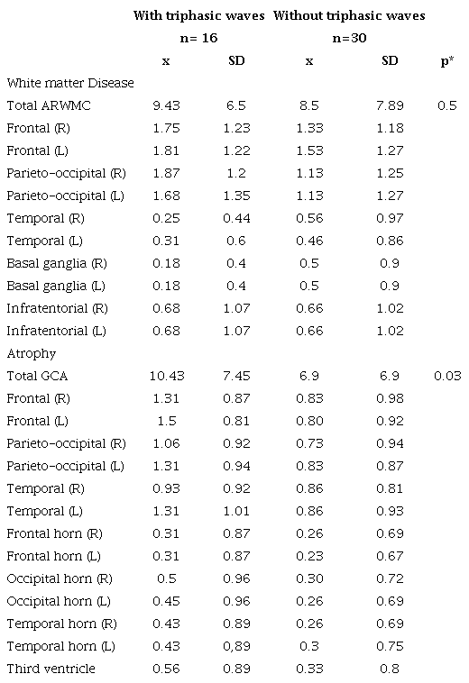 Regarding the EEG, although we did not find a statistically significant difference, the background EEG had slower frequencies in patients with triphasic waves and a more generalized distribution. This could correspond to a deeper degree of encephalopathy 9.