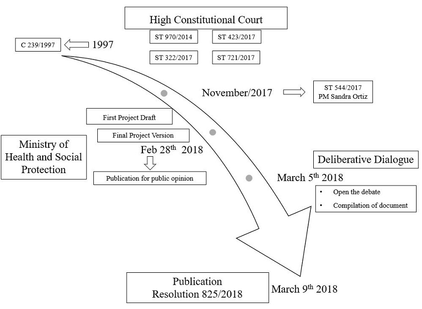 Additionally, the representative of the Ministry of Health and Social Protection presented the draft resolution that regulated the right to die with dignity for children and adolescents. This presentation included an explanation of the legal-technical context that led to the guardianship sentence T-544 of 2017 2, which ultimately gave rise to the ministerial resolution in question, Resolution 825 of 2018 (refer to Figure 2).